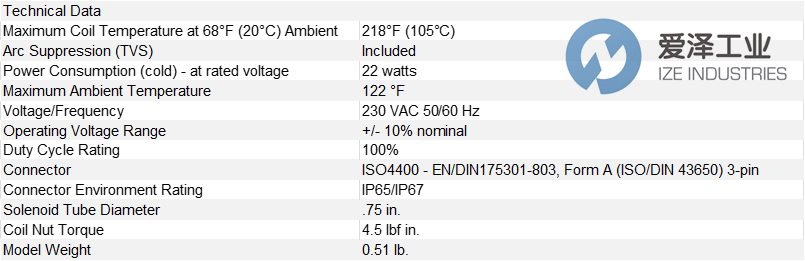 230 VAC 50/60 Hz 線圈,帶 ISO/DIN 43650 A 型連接器和 TVS 二極管