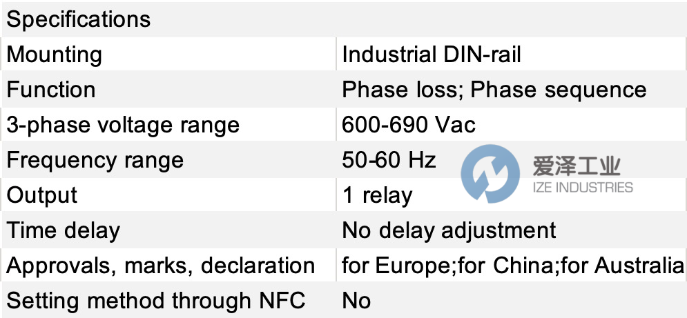 三相缺相與相序監測繼電器,額定范圍 600–690 V AC,單刀雙擲(SPDT)繼電器輸出,回生/再生電壓檢測,22.5 mm DIN 導軌外殼