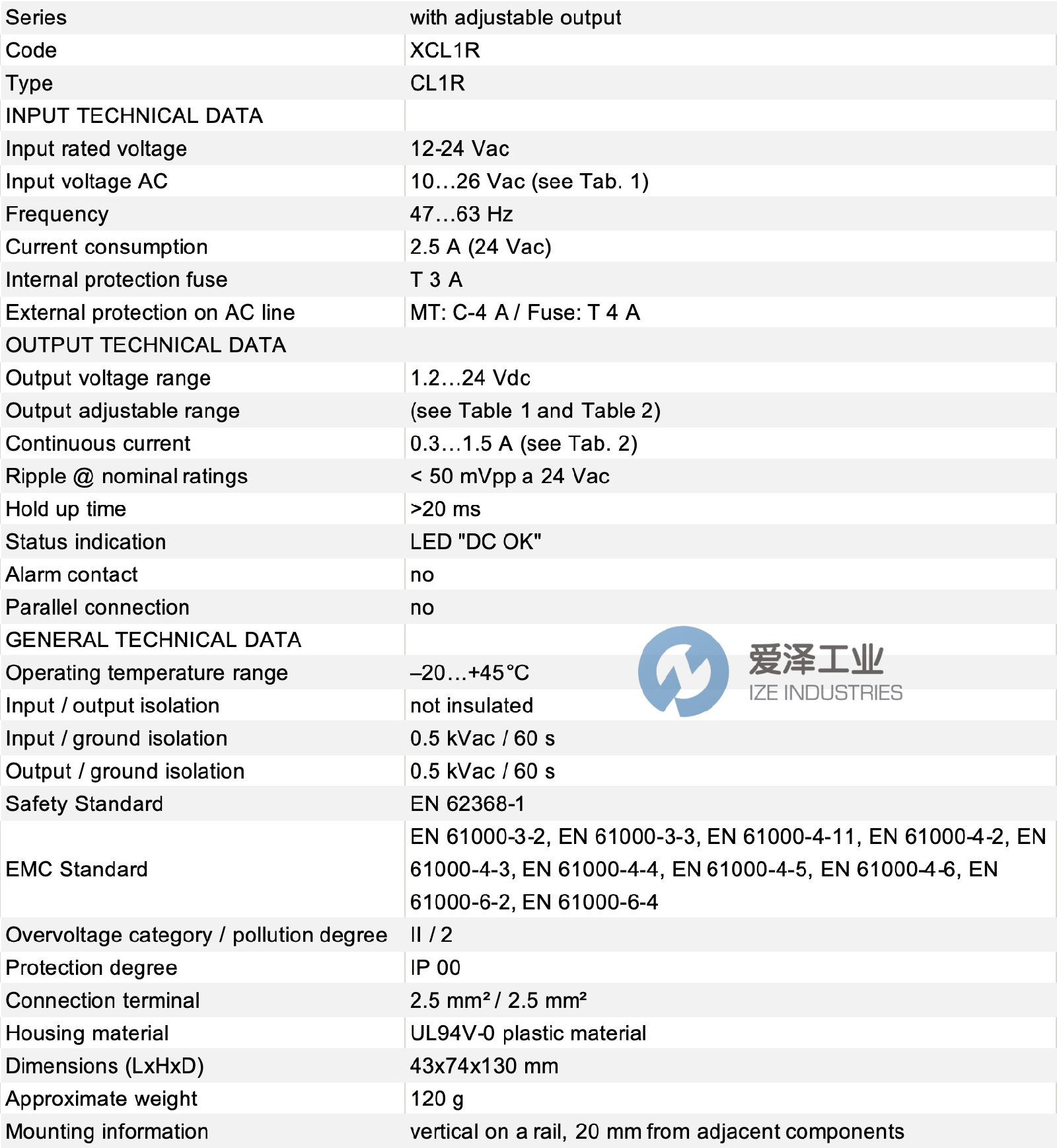 CABUR電源XCL1R技術(shù)參數(shù)