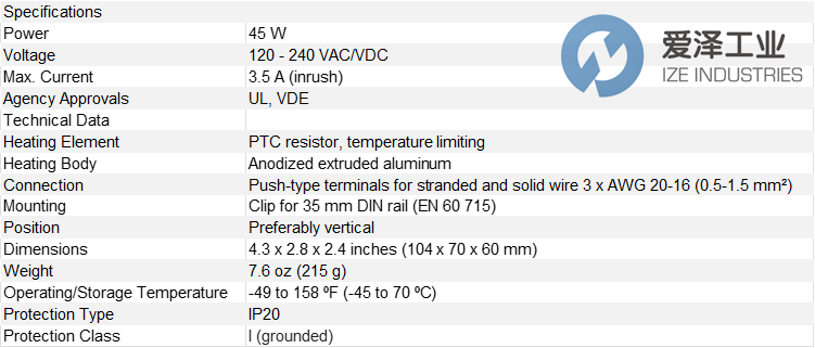 STEGO加熱器14003.0-00技術參數